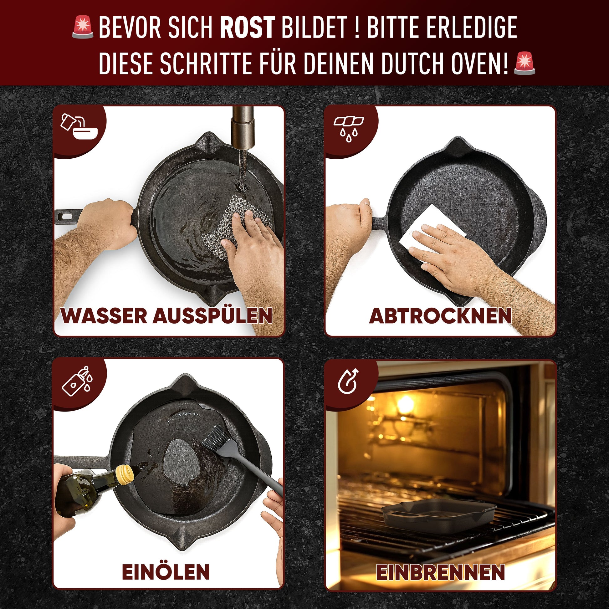 Stellen Sie sicher, dass Sie das Produkt grĂŒndlich reinigen und regelmĂ€Ăig einölen, um Rost zu verhindern und die Antihaft-Eigenschaften zu erhalten.