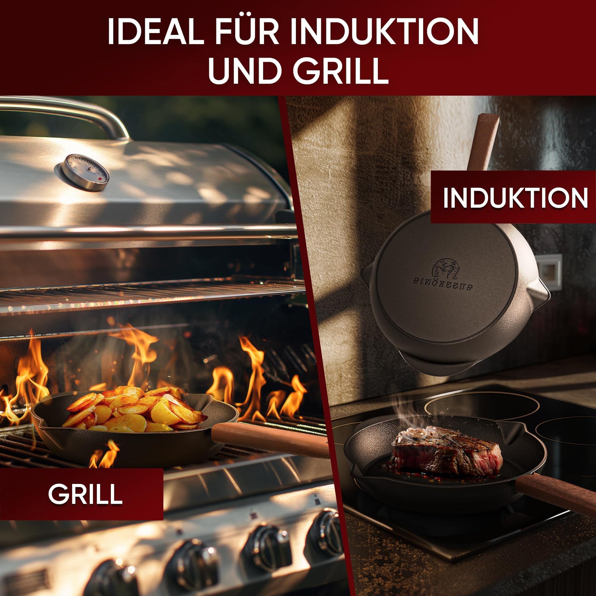 Antwort: Ja, die Gusseisenpfannen sind fĂŒr Gas-, Holzkohle- und Elektrogrills geeignet.