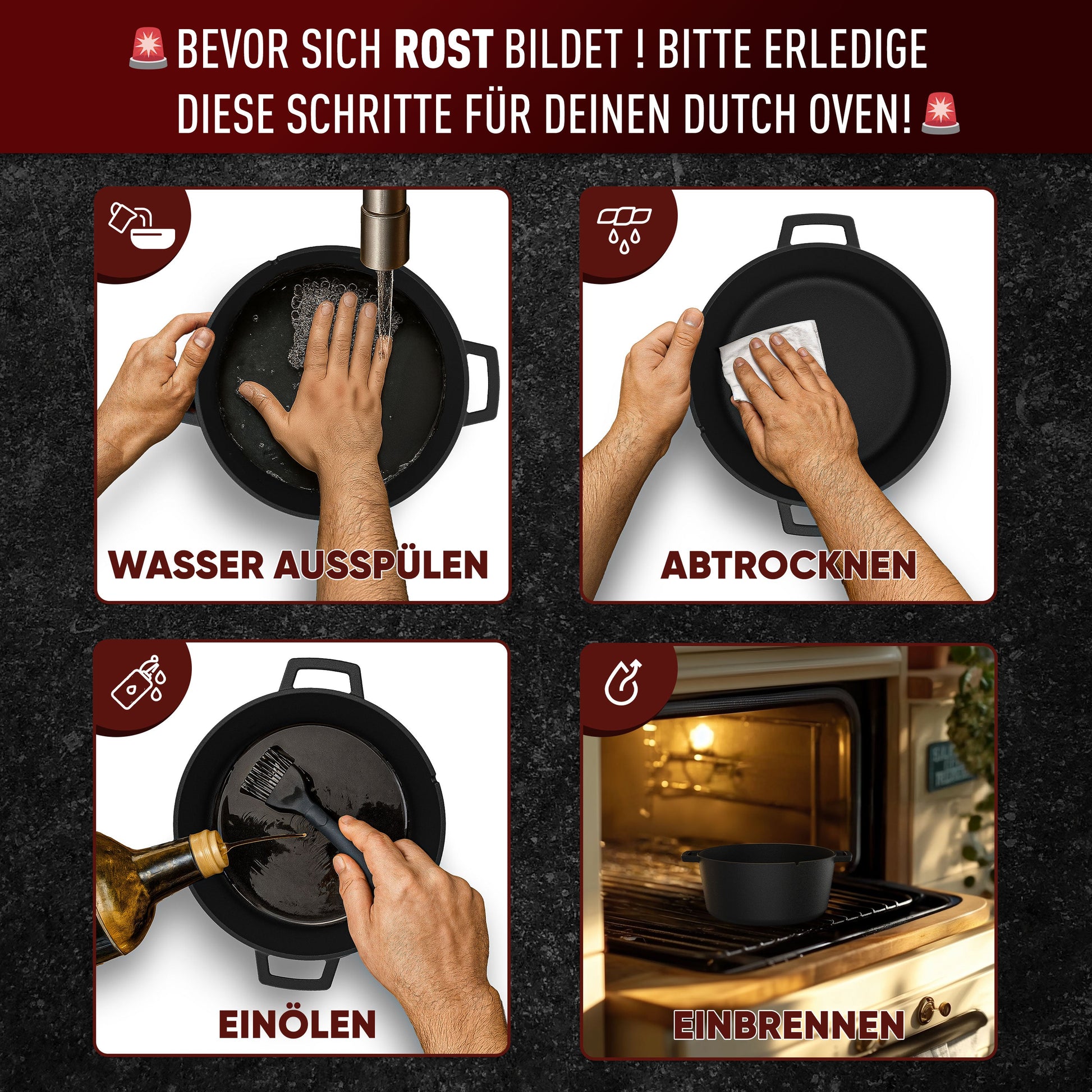 Stellen Sie sicher, dass Sie das Produkt grĂŒndlich reinigen und regelmĂ€Ăig einölen, um Rost zu verhindern und die Antihaft-Eigenschaften zu erhalten.