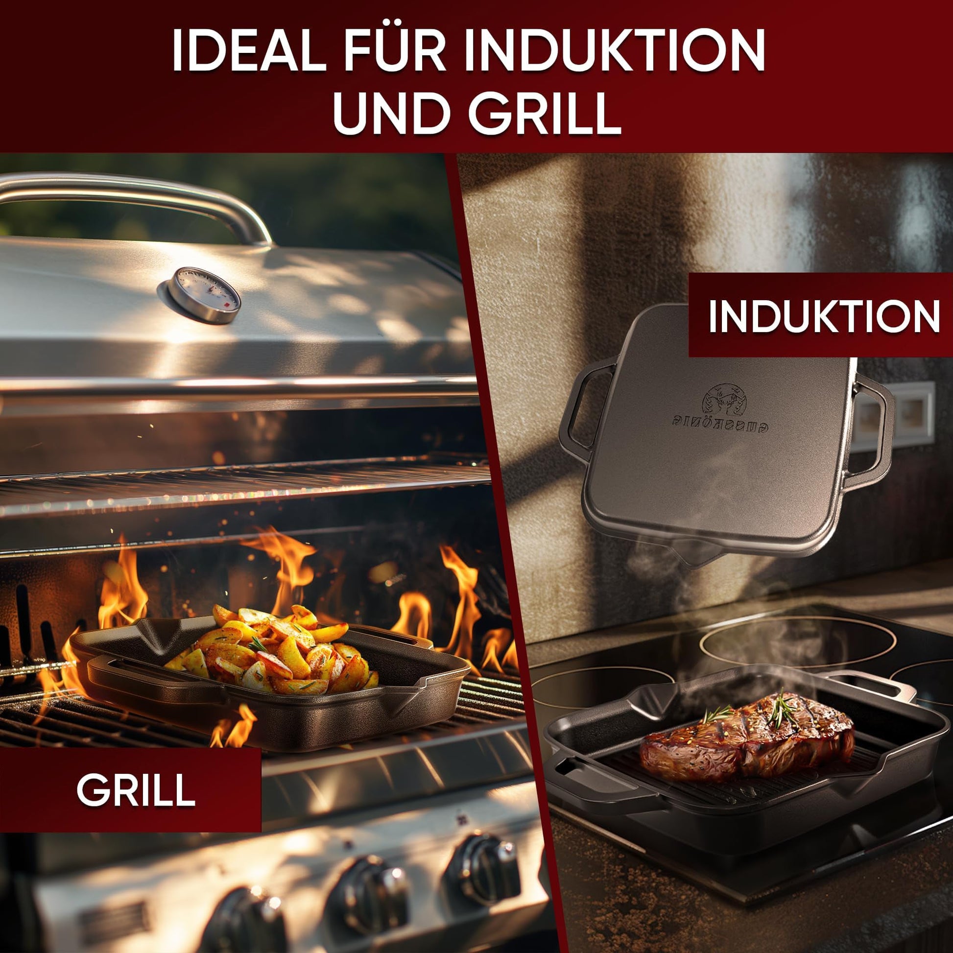 Antwort: Ja, die Gusseisenpfannen sind fĂŒr Gas-, Holzkohle- und Elektrogrills geeignet.
