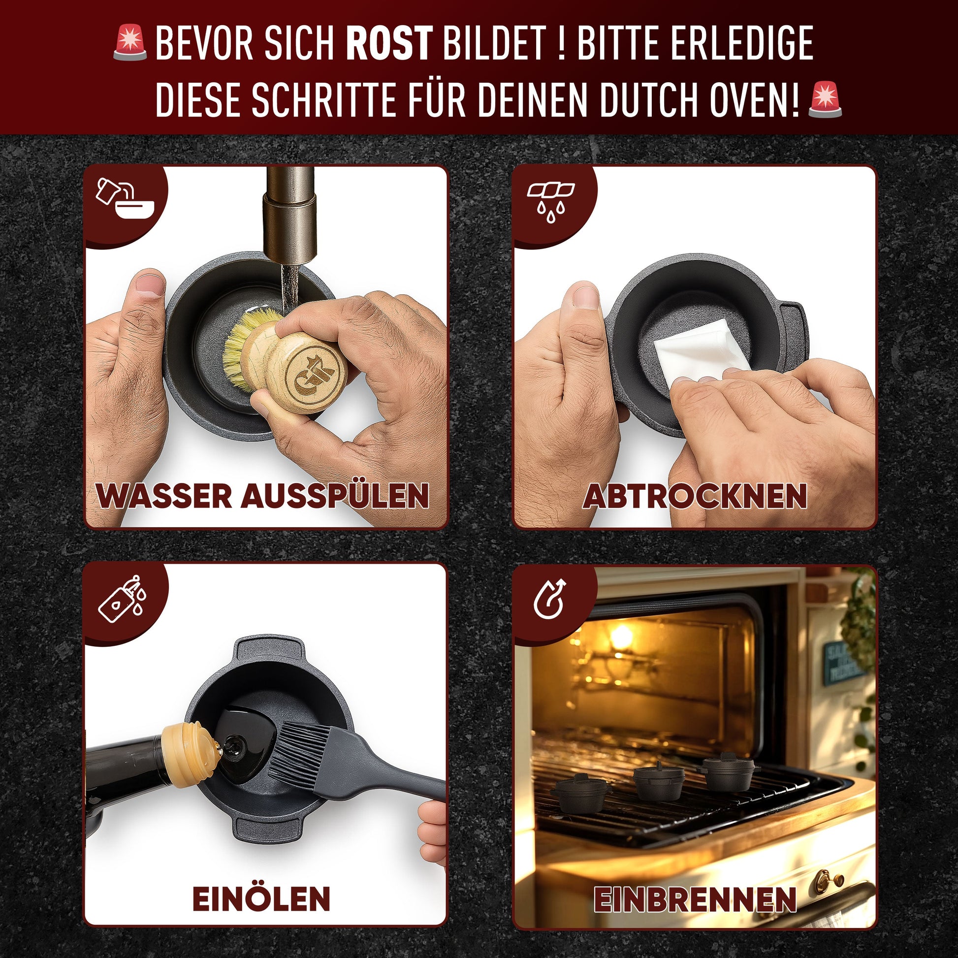 Stellen Sie sicher, dass Sie das Produkt grĂŒndlich reinigen und regelmĂ€Ăig einölen, um Rost zu verhindern und die Antihaft-Eigenschaften zu erhalten.