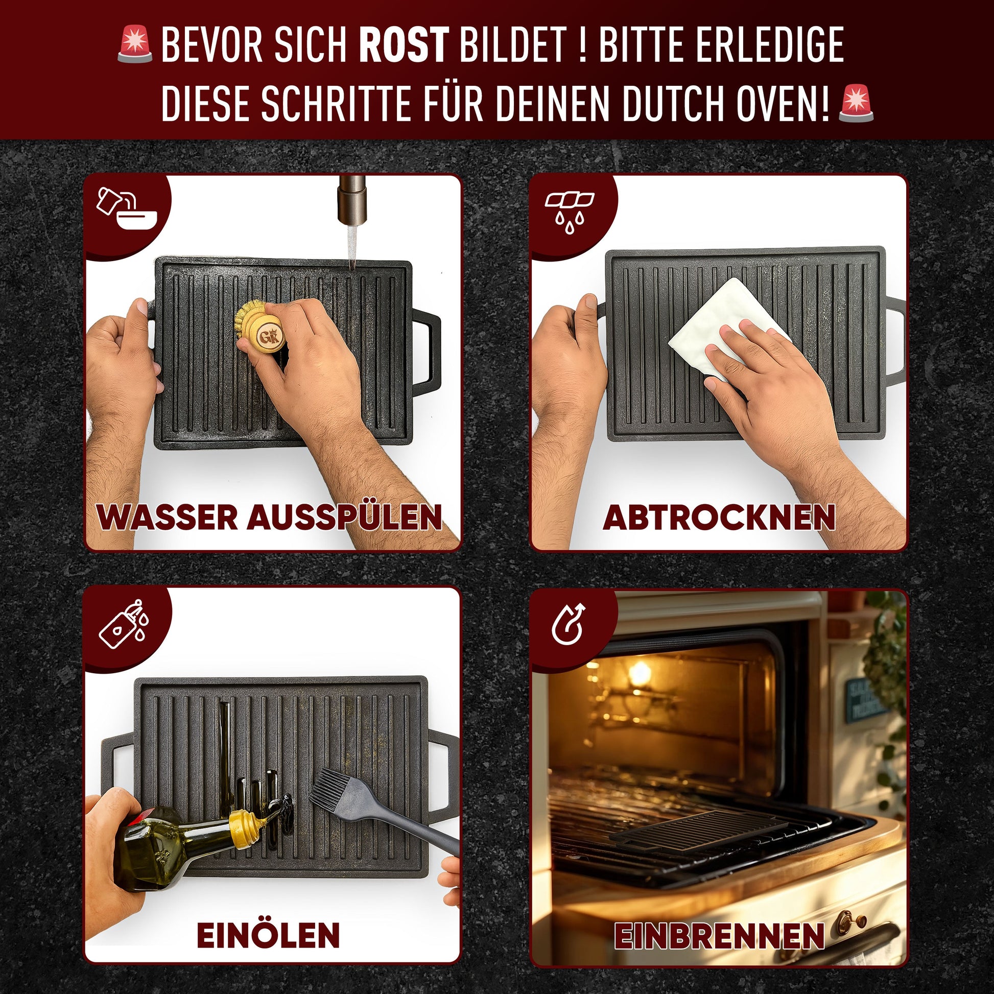 Stellen Sie sicher, dass Sie das Produkt grĂŒndlich reinigen und regelmĂ€ĂŸig einölen, um Rost zu verhindern und die Antihaft-Eigenschaften zu erhalten.