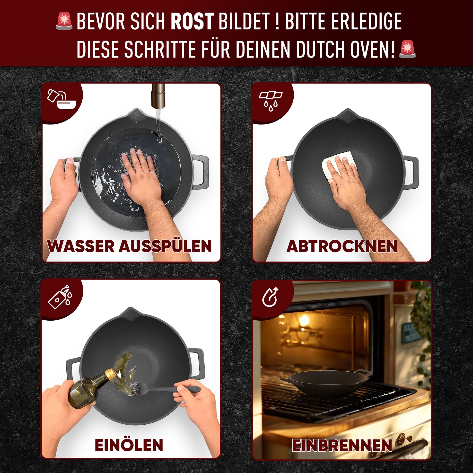 Stellen Sie sicher, dass Sie das Produkt gründlich reinigen und regelmäßig einölen, um Rost zu verhindern und die Antihaft-Eigenschaften zu erhalten.
